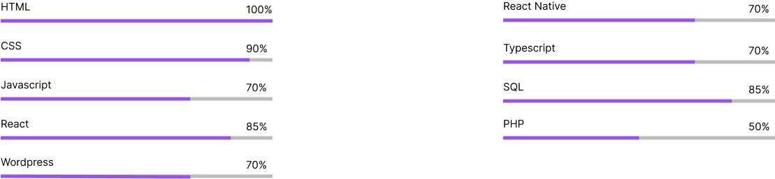 HTML, CSS, Javascript, Typescript, React, React Native, Styled Components, Bootstrap, Wordpress